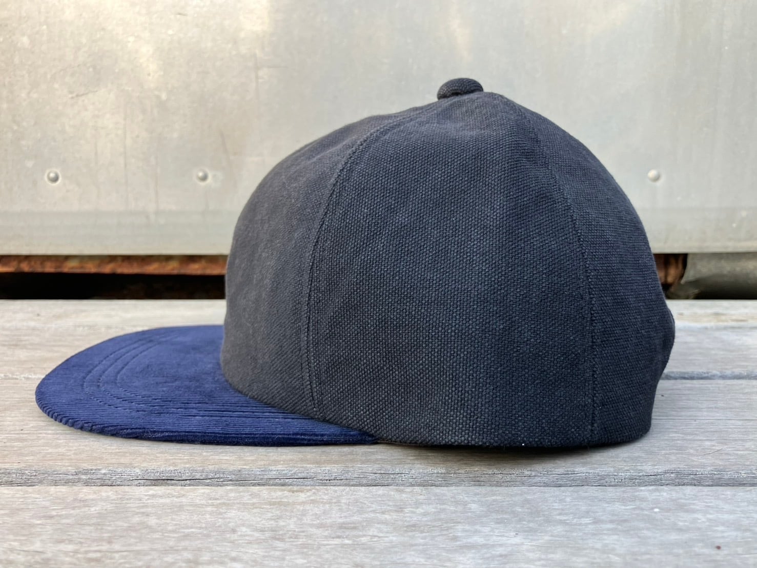 ツバ部分には細畝のネイビーコーデュロイを